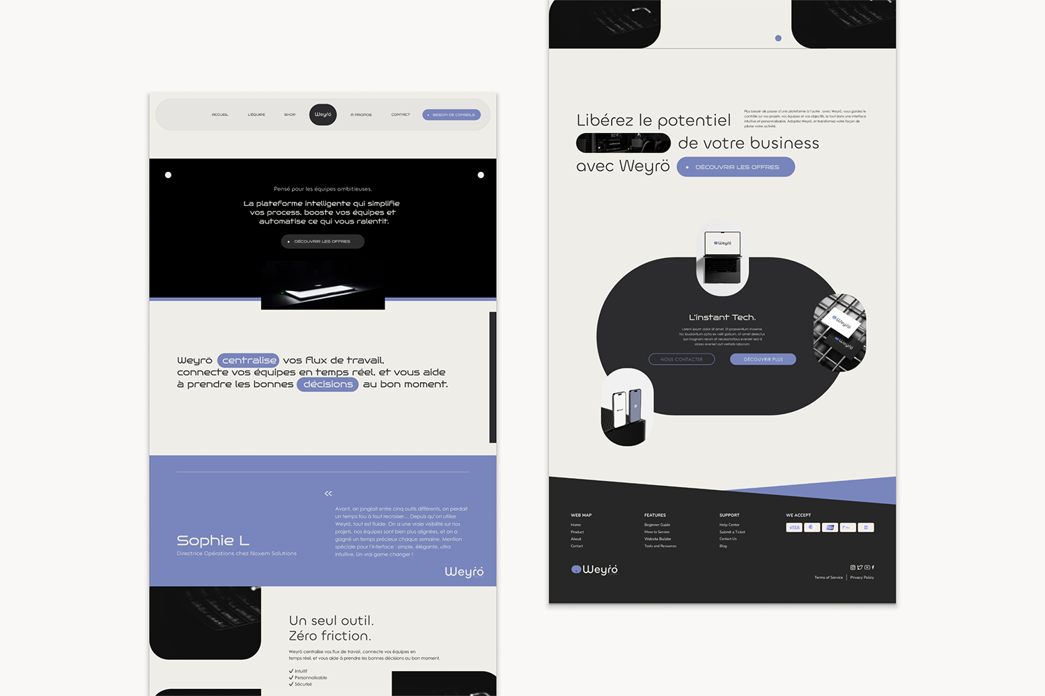 Conception d’une plateforme web innovante pour Weyrö, l’outil intelligent dédié à la simplification des processus métier et à l’automatisation des flux de travail. Ce projet web combine une esthétique futuriste et une structure ergonomique pour transformer la complexité technique en une expérience utilisateur fluide et intuitive.